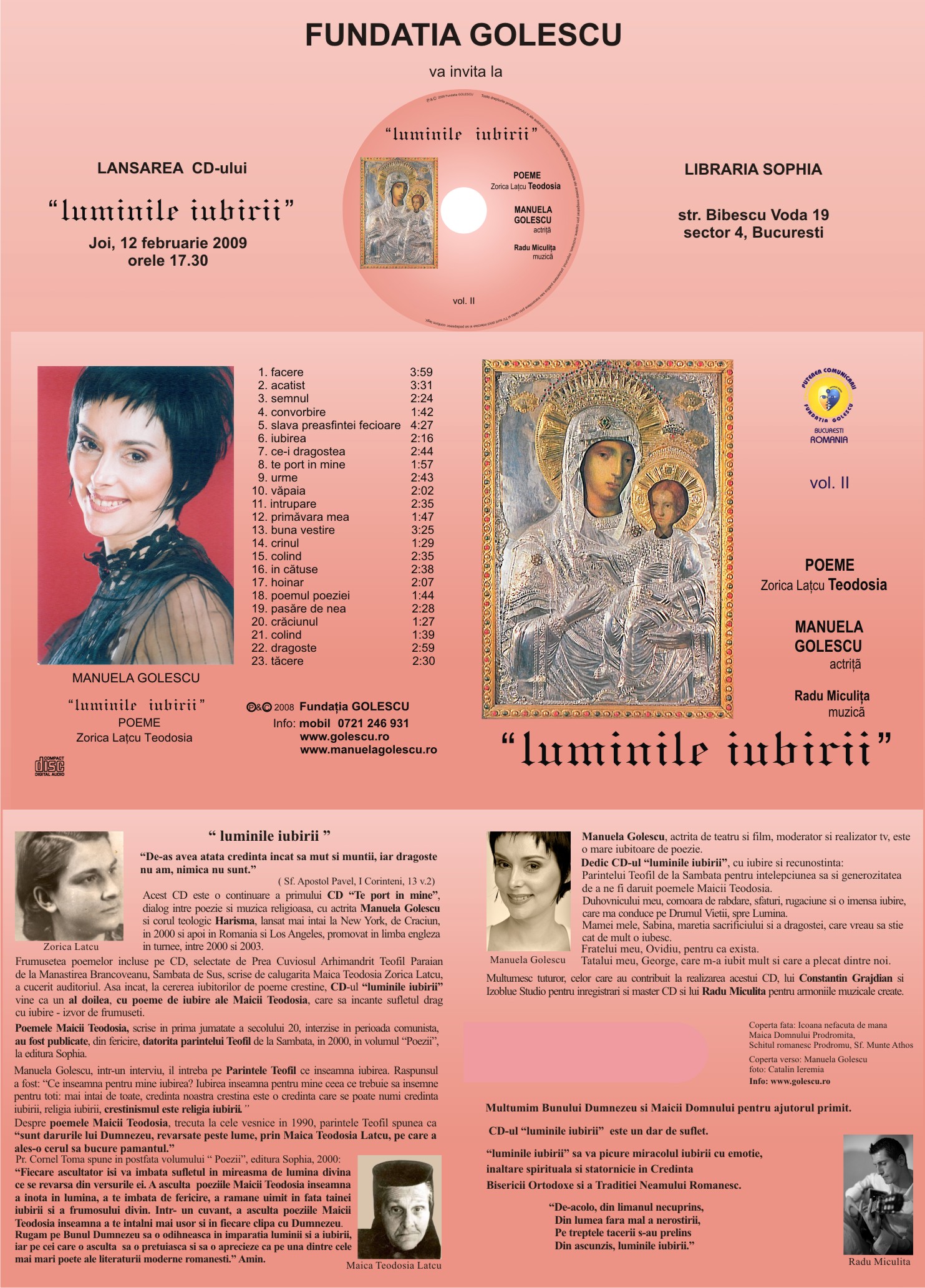CD-ul “luminile iubirii” este unic si inedit si cuprinde o selectie din poemele crestine de iubire ale Maicii Tedosia Zorica Latcu, scrise inainte si dupa ce a devnit calugarita. Sunt 23 de poeme in interpretarea actritei Manuela Golescu, in armonii de chitara clasica, de Radu Miculita.